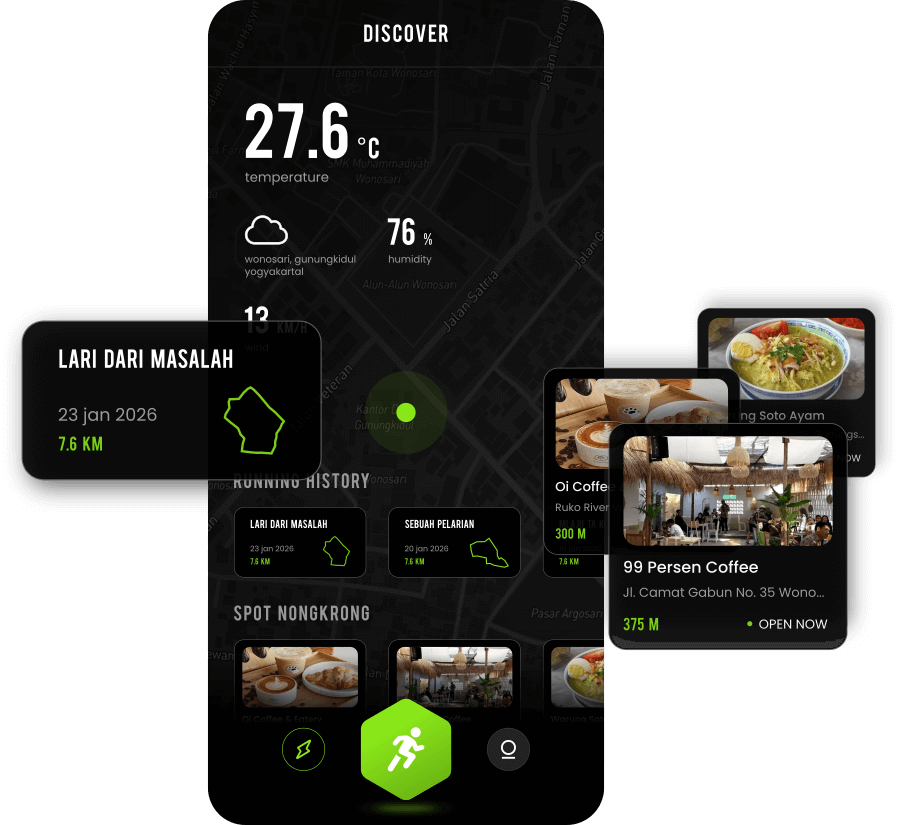 Morning run, city run, coffee run, atau meal run? tinggal pilih! Fitur nearby coffee & eats siap nemenin dan nganterin kamu ke tempat nongkrong lokal terdekat buat recovery after lari yang asik bareng temen-temen!