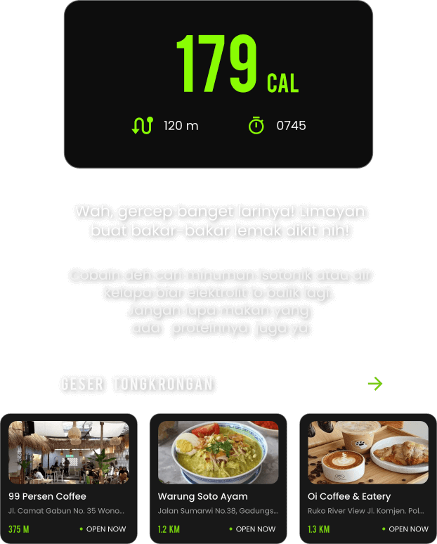 Kelar lari masih harus ngitung kalori, cara yang pas buat recovery, sama cari spot geser? Ga usah risau~ Mlaju AI bakal bantu kamu bikin analisis sekaligus ngasih saran recovery yang paling cocok sama kondisimu. Less calories? No worries. Mlaju AI juga akan ngasih rekomendasi spot recovery terdekat dari lokasimu. Fitur ini cocok banget untuk post-run essentials kamu!